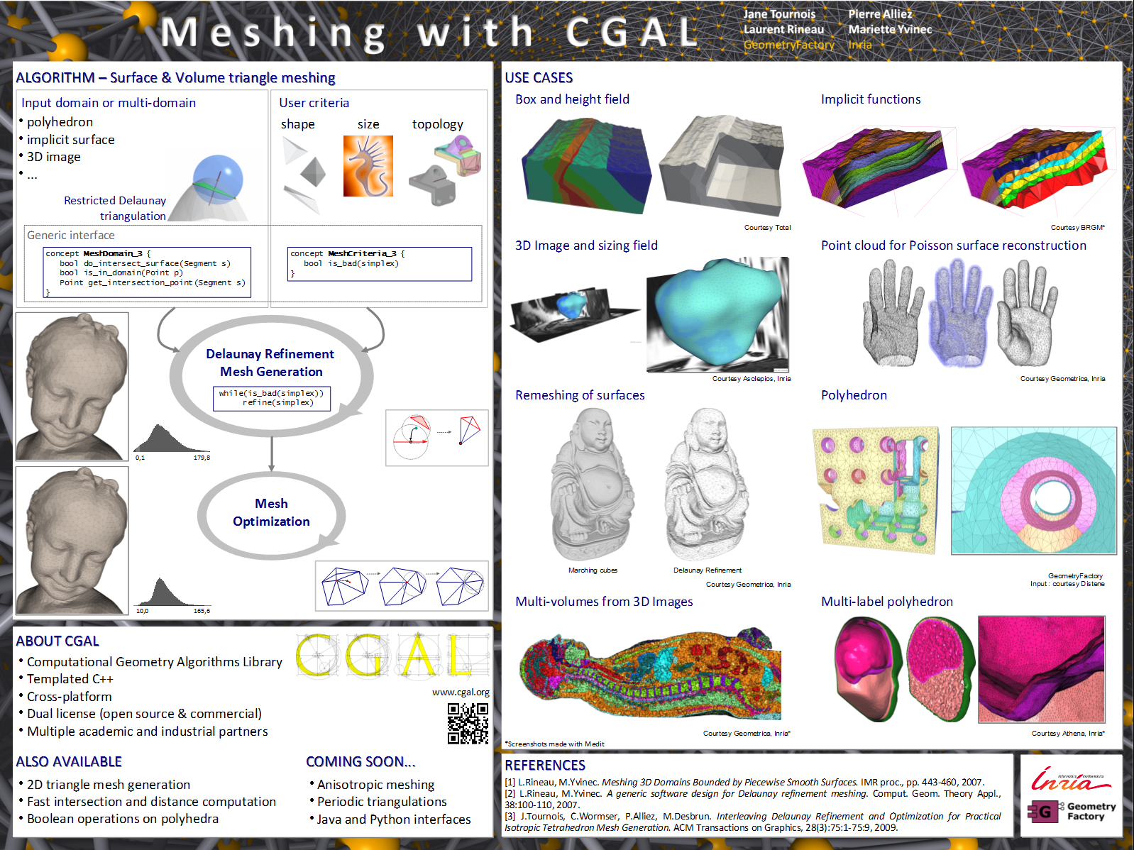 Jane Tournois, Pierre Alliez, Laurent Rineau, and Mariette Yvinec received the Meshing Maestro Award at the 20. International Meshing Roundtable, for their poster Meshing with CGAL.