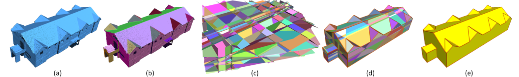 Polygonal surface reconstruction: (a) Input point set; (b) Extracted planar segments; (c) Candidate faces are generated by pairwise intersection; (d) Faces selected through optimization; (e) Reconstructed model.