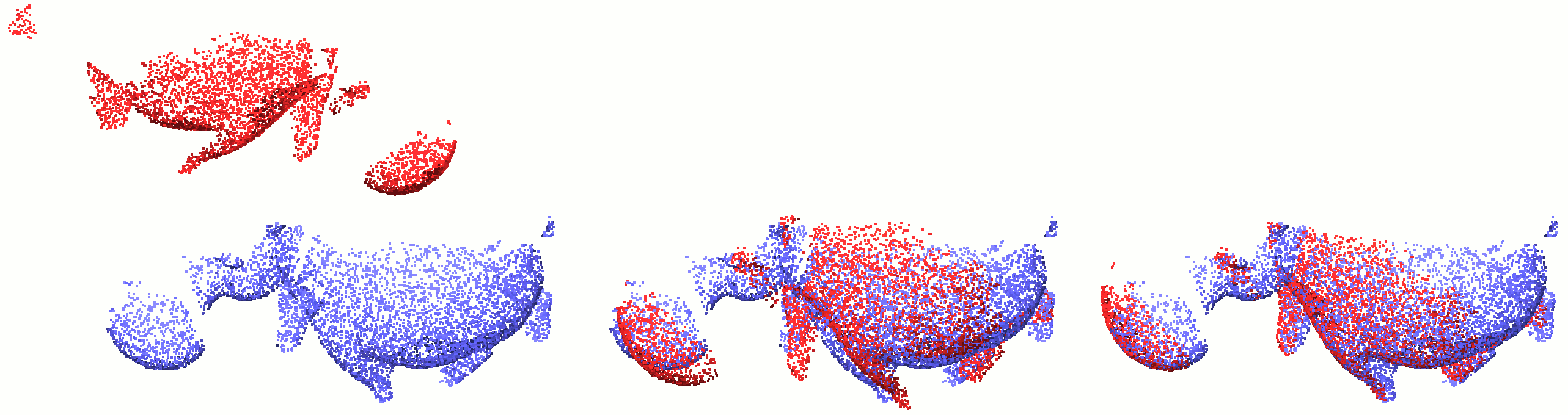 From two arbitrarily located and arbitrarily oriented point clouds, OpenGR computes a global registration transformation: applying this transformation to the second point cloud makes it coarsely registered with the first one.