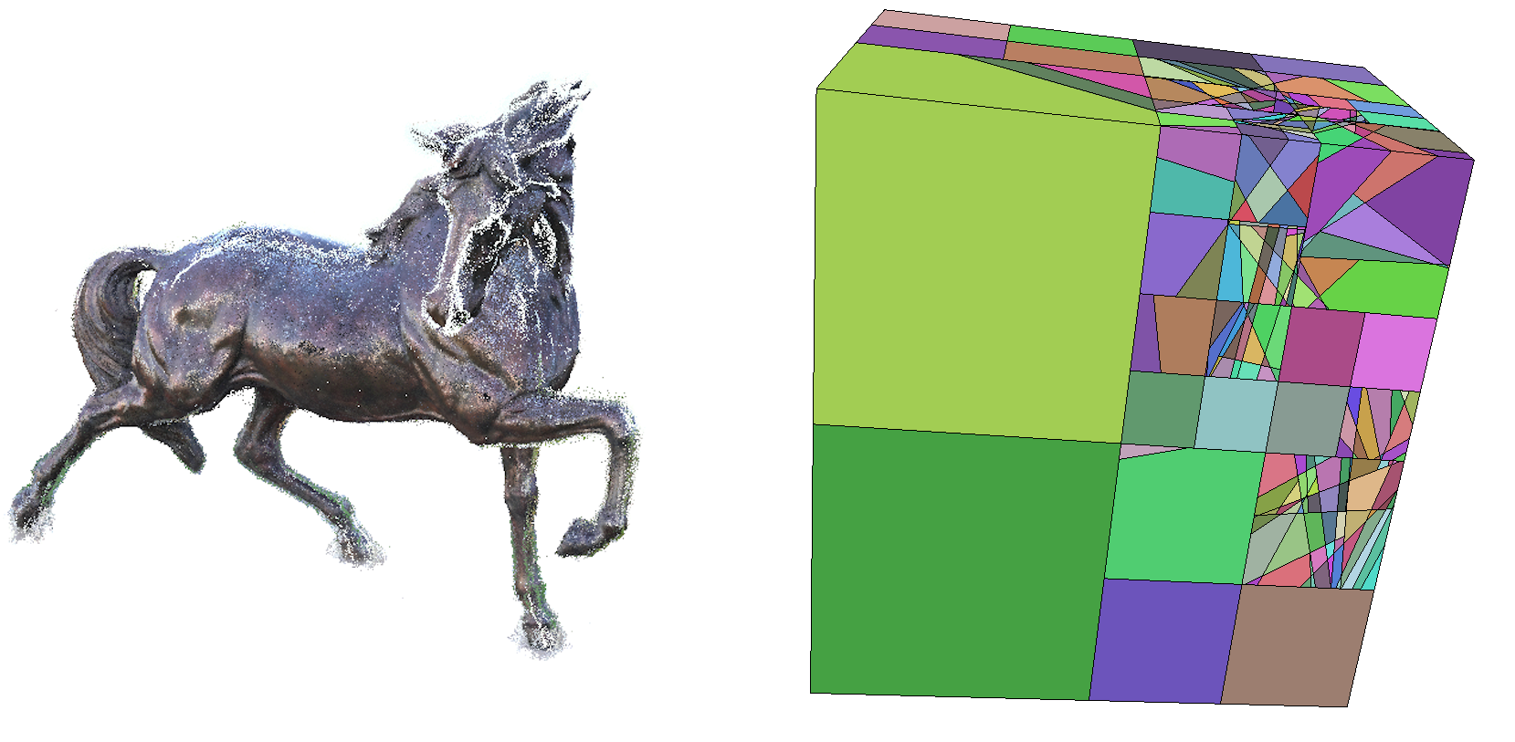 Kinetic Surface Reconstruction (CGAL::Kinetic_surface_reconstruction_3) is a new package that implements a state-of-the-art 3D reconstruction pipeline based on another new package, Kinetic Space Partition(CGAL::Kinetic_shape_partition_3). While the Kinetic Space Partition is the core mechanism providing the geometry for the reconstruction (more on that later), other steps are necessary to extract the 3D surface from the partition. Our pipeline is based on Bauchet, J.-P., & Lafarge, F. (2020). Kinetic Shape Reconstruction. In ACM Transactions of Graphics, 39(5), 2020, and takes an oriented point cloud as input and generates a watertight 3D polygonal surface.