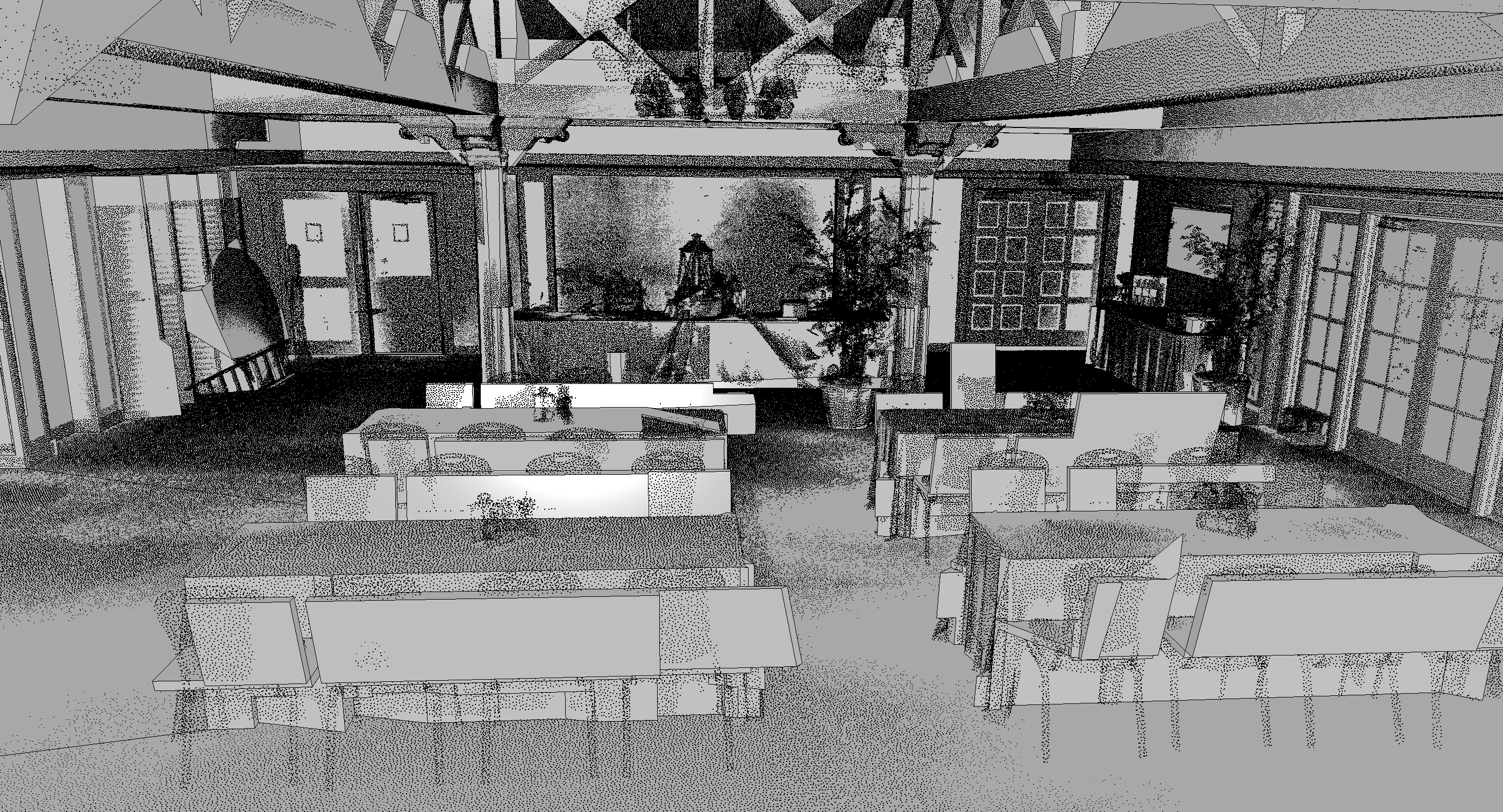 The runtime of the Kinetic Surface Reconstruction depends mostly on the Shape Detection and the Kinetic Space Partition. The use of Shape Regularization is optional, but can increase the performance and the quality of the reconstruction, particularly in the case of architecture and piecewise-planar objects. The indoor point cloud used in the first two figures has around 3 million points and the reconstruction of the model takes around 132 seconds. The church model has around 1.2 million points and was reconstructed in around 36s.
