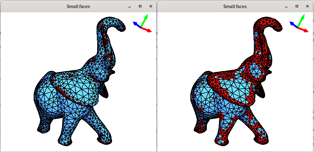 Two examples of drawing of a mesh with small faces in red. Left: With the initial threshold. Right: After having increased the threshold.