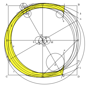 " Construct first a square ABCD, and bisect AC at E, BD at F, AB at G, and CD at H. Draw the straight lines EF and GH, thereby establishing a point I at their intersection. From the center I, describe a circle JIK on EF, the diameter of which is one-ninth the distance AB. Using that same radius, describe a circle LJI, thereby establishing a point N on the perimeter of the circle I. ....... "